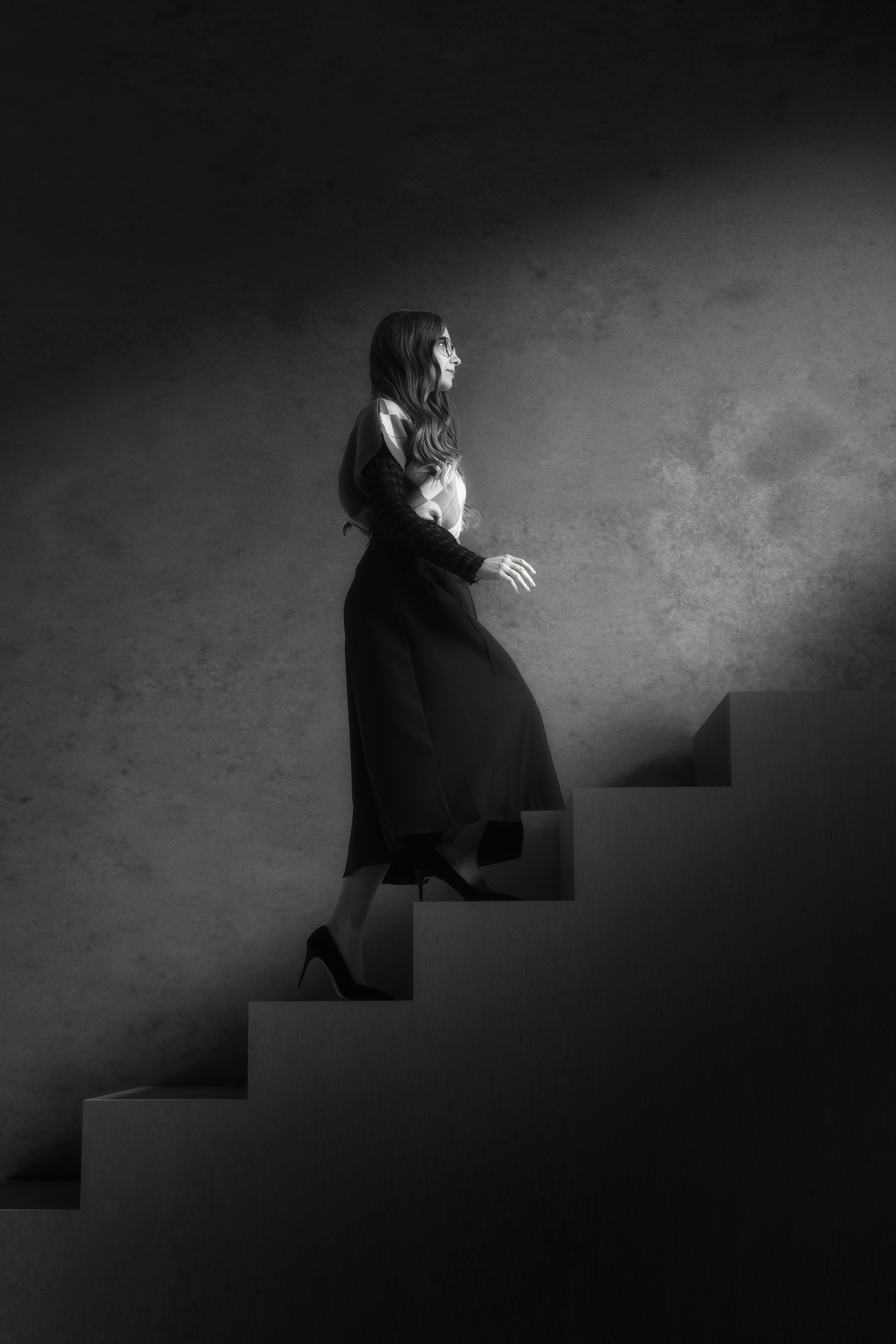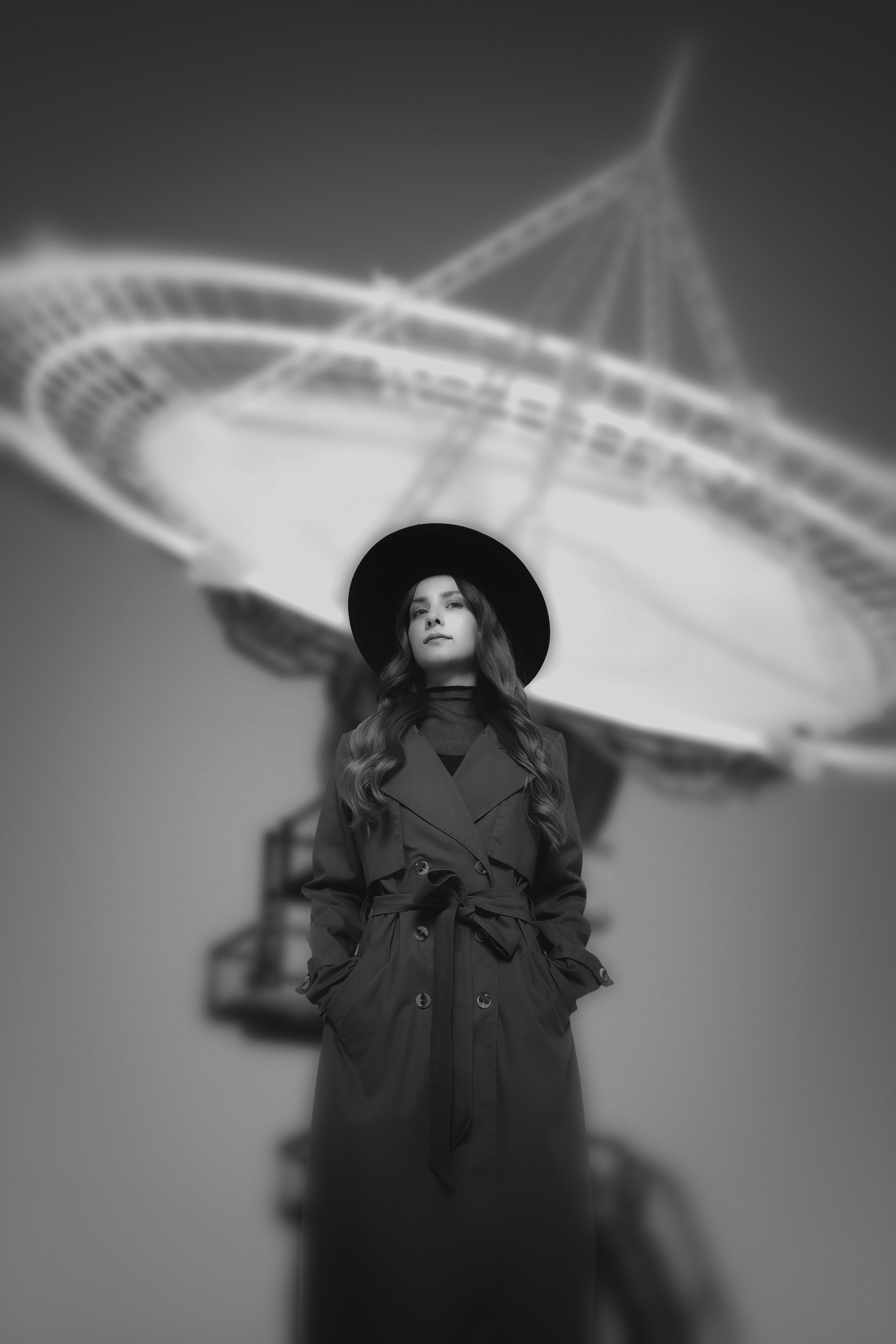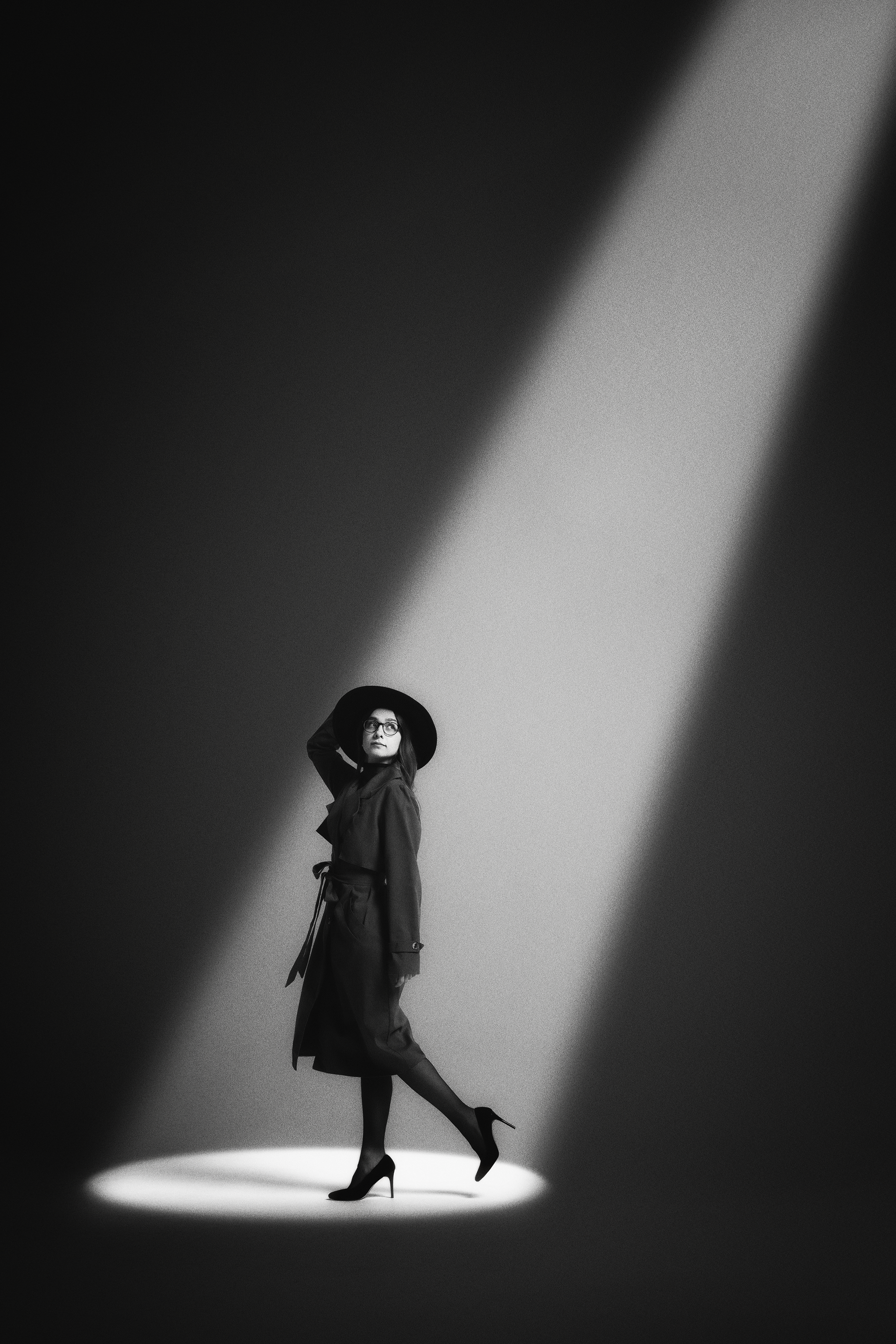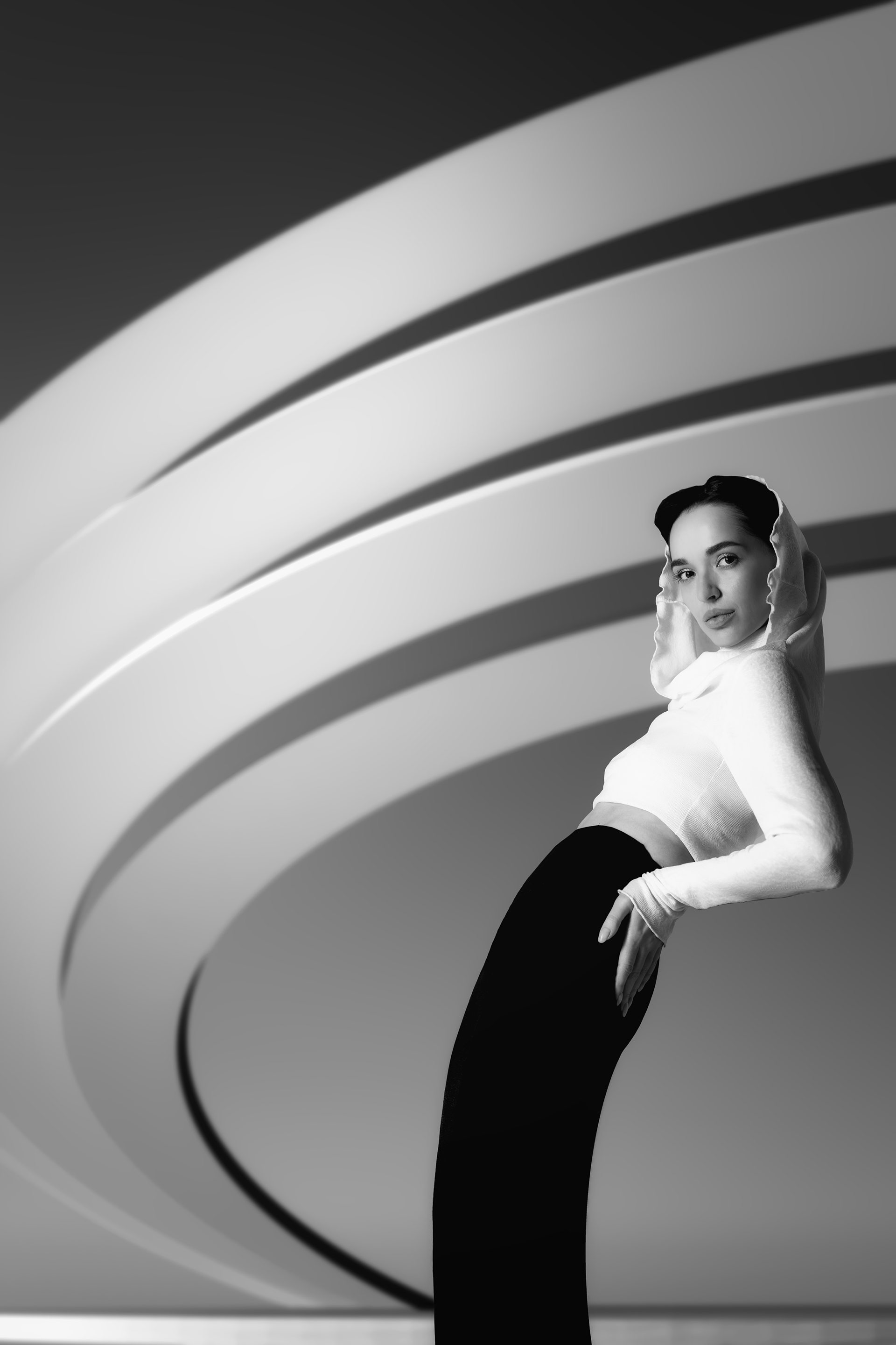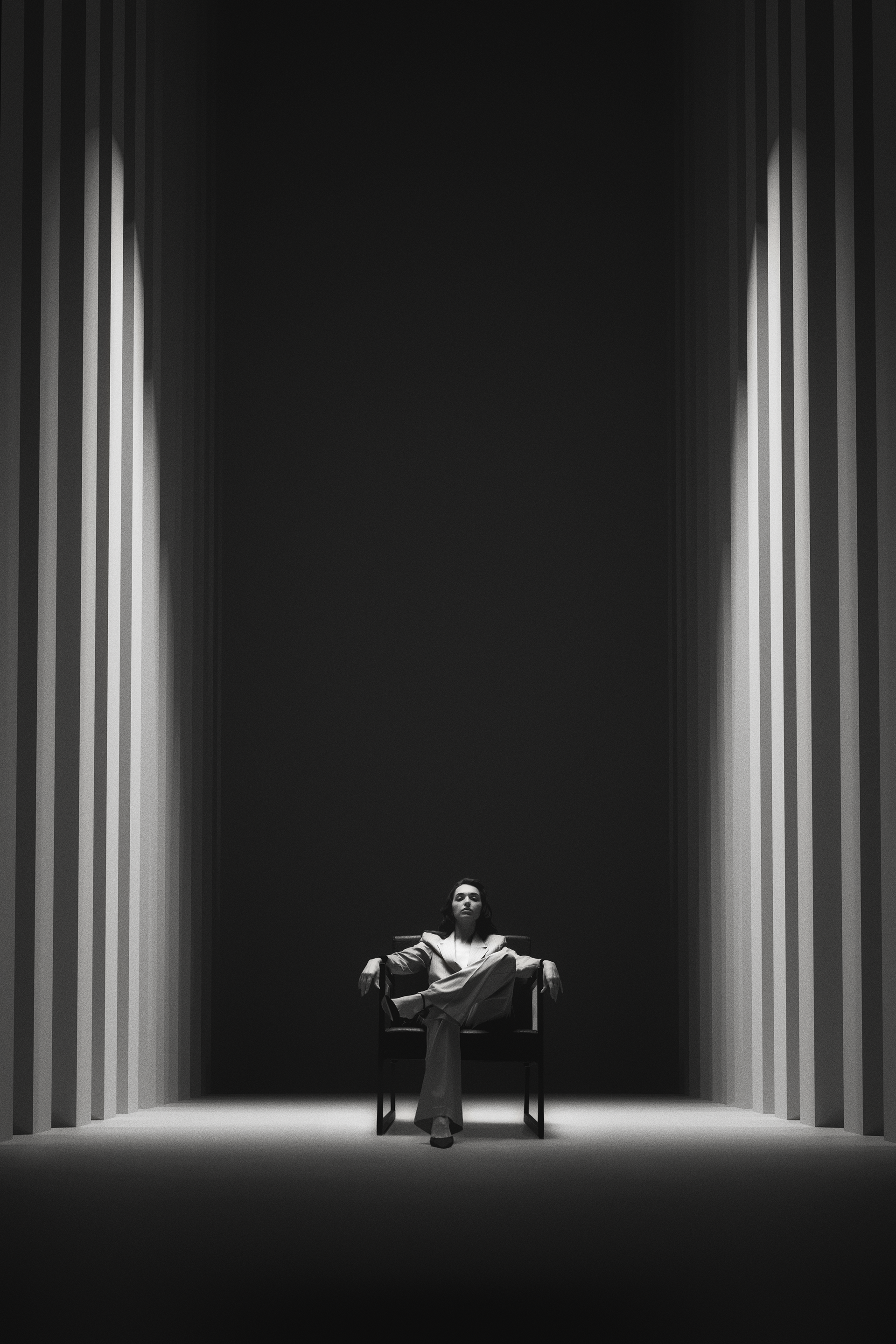 These images were born from stillness. A period of isolation and war became an unexpected space for inner dialogue — with light, with form, with something unnamed. Each photograph in this collection is a separate conversation between the human figure and the world around it — architecture, geometry, shadow. Silence as a state. Solitude as a choice. The search for connection with something beyond the visible. Black and white not as a stylistic decision, but as the only honest language for what needed to be said.
